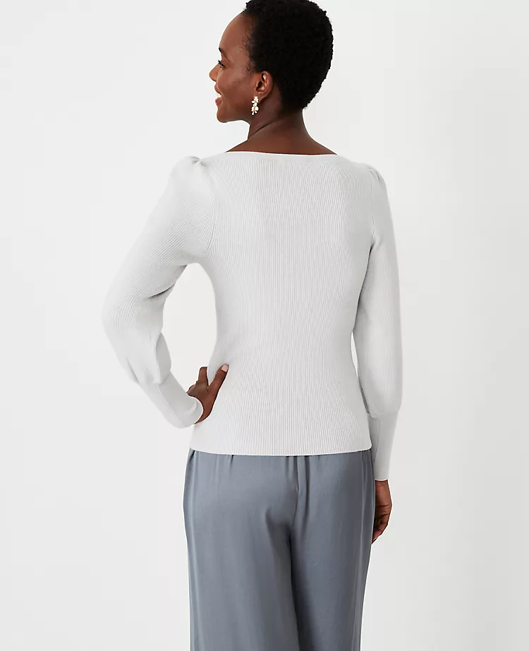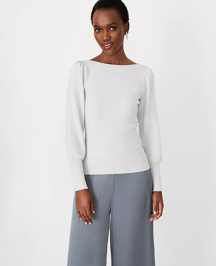 Balloon sleeves add a refined air to this beautifully ribbed sweater. Boatneck. Long sleeves with shirred sleeve caps.