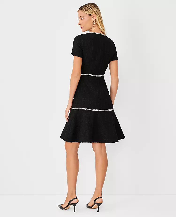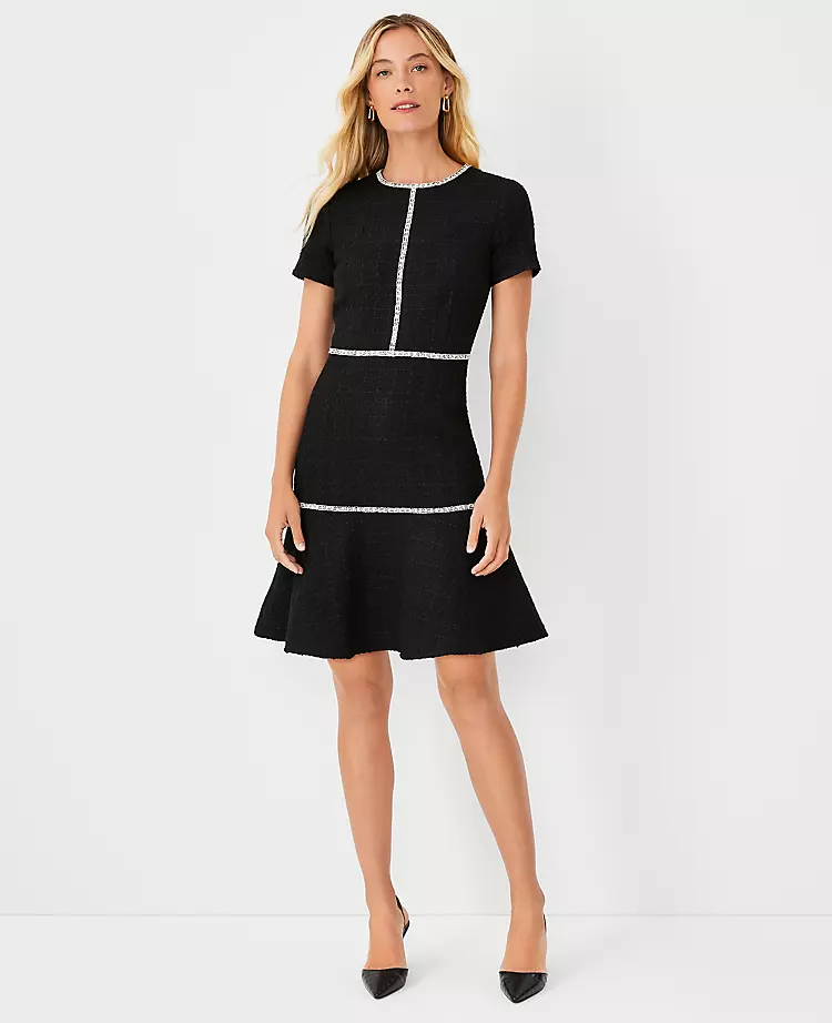 Refined contrast trim adds an especially polished touch to our textured tweed flounce dress. Crew neck. Short sleeves. Hidden back zipper with hook-and-eye closure. Lined body.