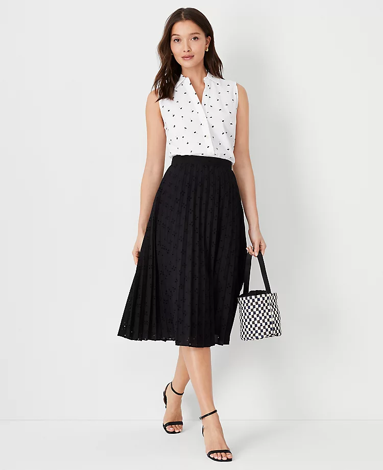 Keep it breezy and fresh with this pleated skirt, done in pure cotton eyelet. Hidden back zipper with hook-and-eye closure. Lined.