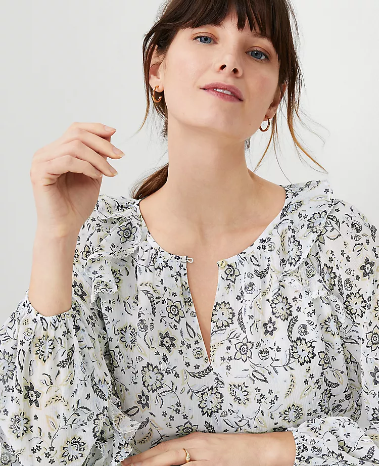 Romantic ruffles paired with pretty pintucks equals feminine perfection – in an irresistibly charming mix. Shirred jewel neck with front slit and button closure. Long raglan sleeves with shirred sleeve caps and elasticized cuffs. Lined body.