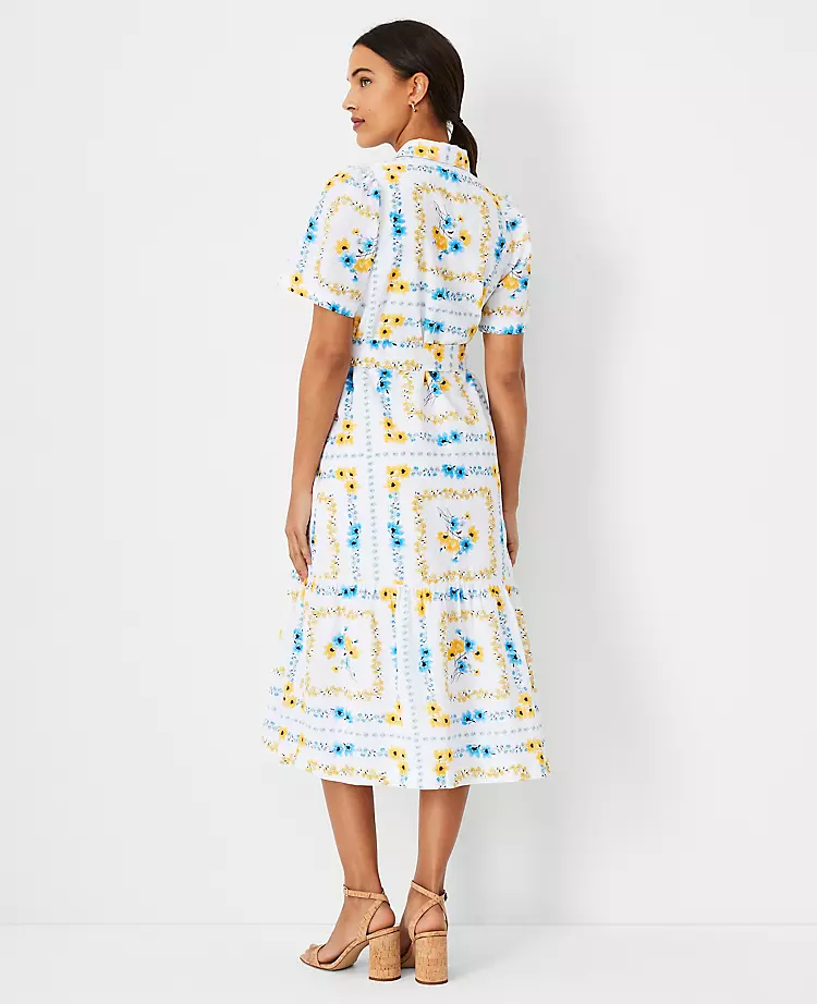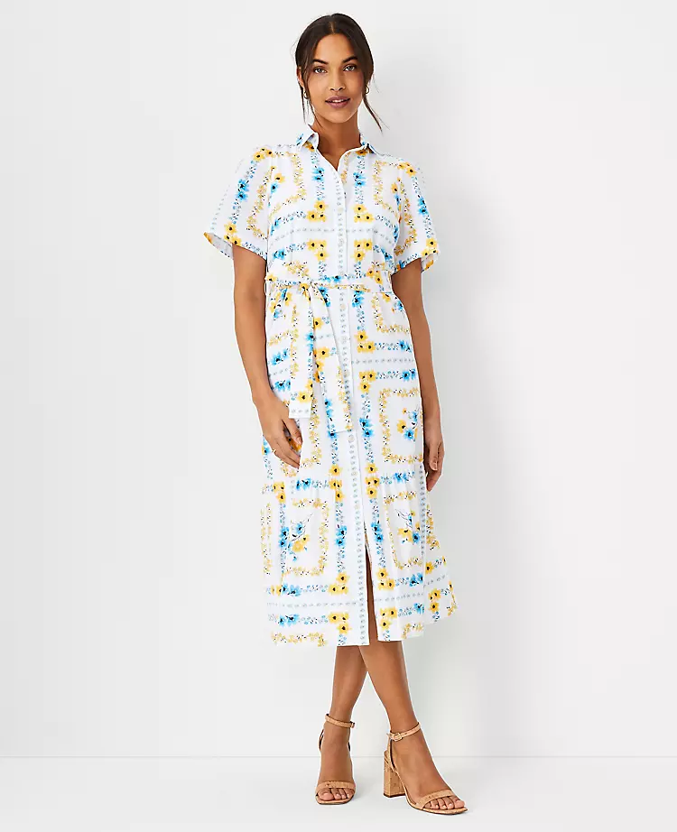 Versatile and endlessly flattering, our belted floral square shirtdress is truly one and done – just cinch and go. Point collar. Short sleeves with shirred sleeve caps. Button front. Self tie belt. Peplum hem. Lined body.