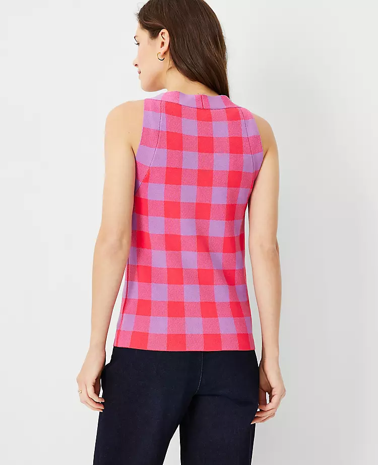Our square neck sweater shell scores a check plus in season-fresh gingham plaid. Square neck. Sleeveless.