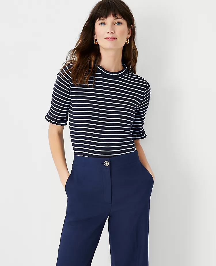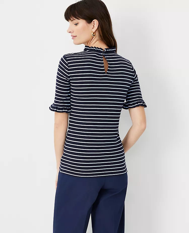 Artfully ruffled at the neck, our cotton elbow sleeve top is as romantic as it is versatile. Ruffle crew neck. Elbow sleeves. Back slit with hook-and-eye closure.