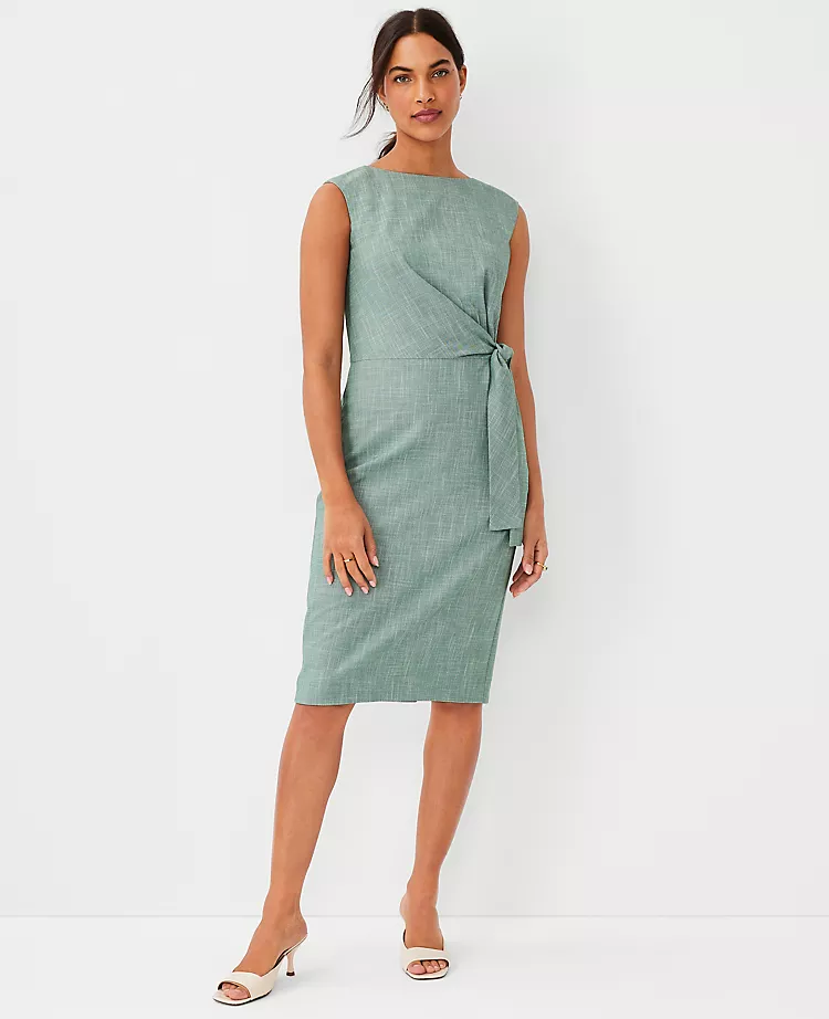 Our all-season cross weave fabric features a textured effect, created by sets of parallel and vertical threads crossing each other. It elevates our timeless sheath dress, tied at the waist for a feminine twist. Jewel neck. Cap sleeves. Self waist ties. Hidden back zipper with hook-and-eye closure. Back vent. Lined.