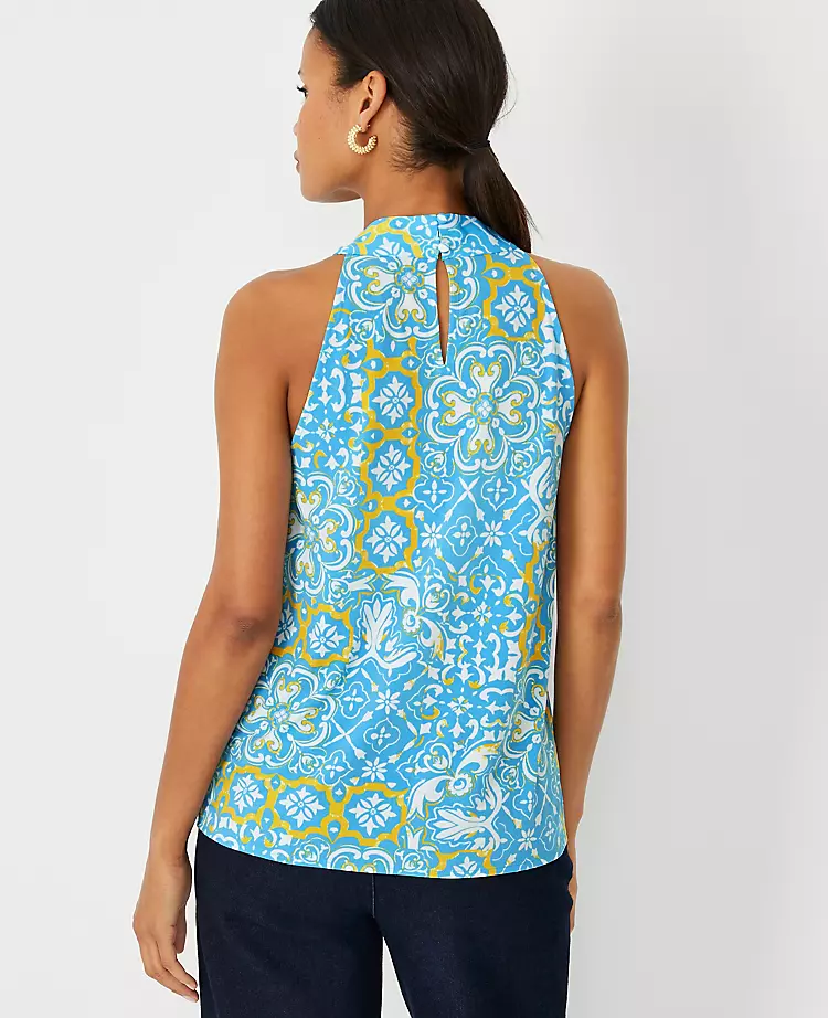 Beautifully draped with a knotted neckline, our mixed media halter flatters from day to night. Pleated halter neck. Back slit with button closure. Woven front. Knit back.