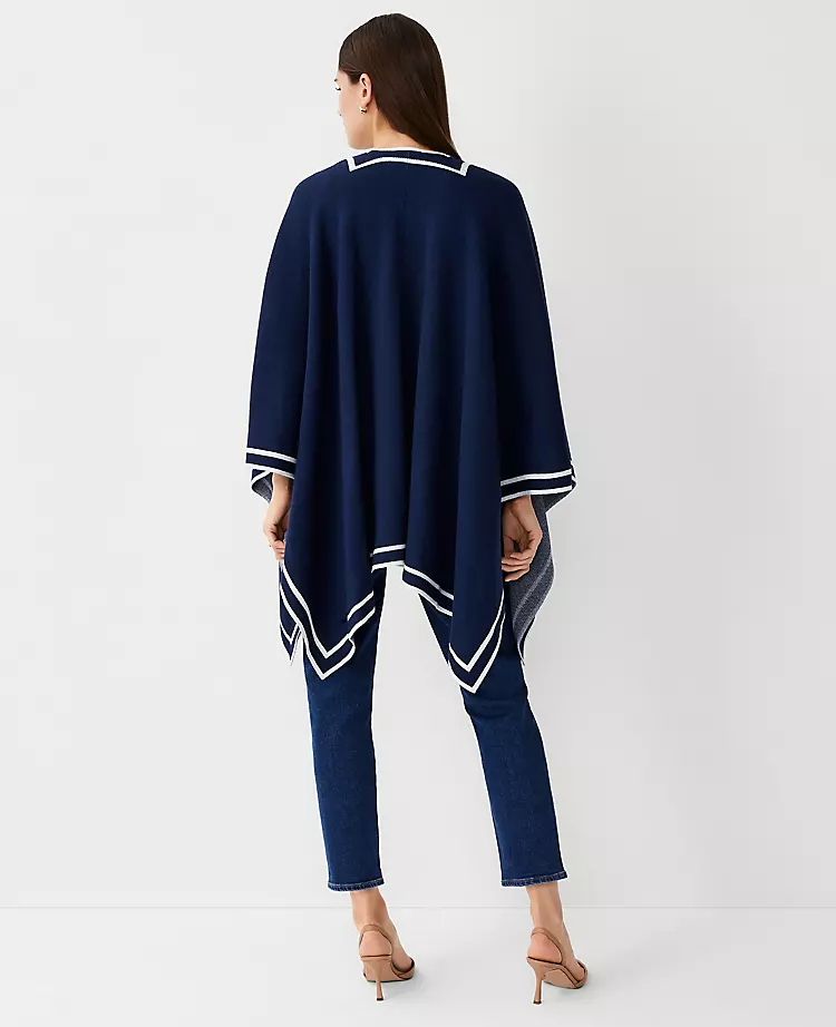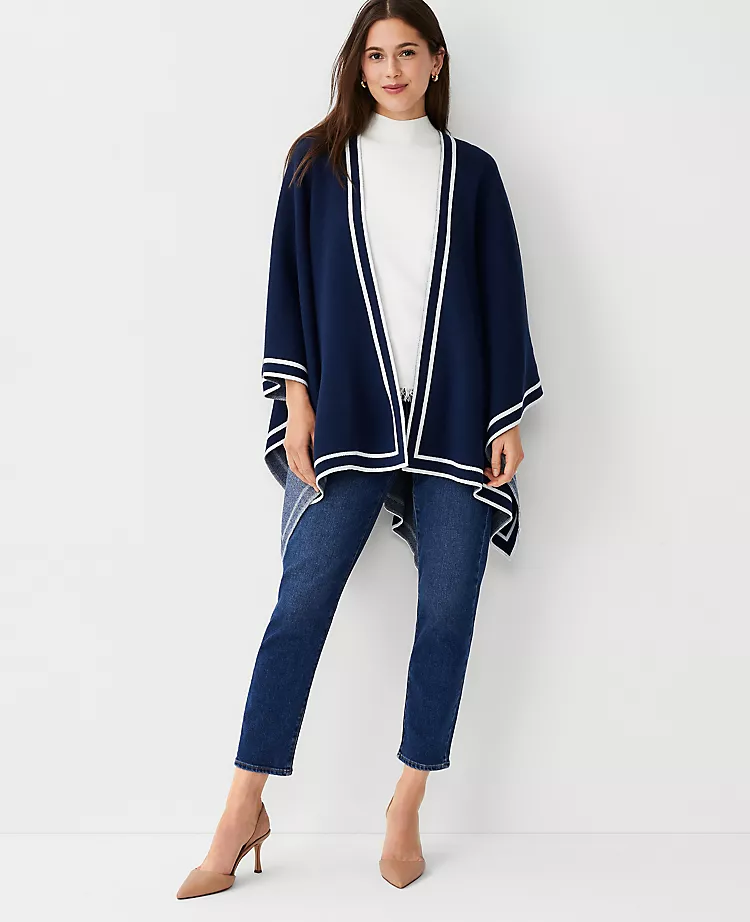 With modern drape and flow, our tipped open poncho is always at ease. Open front. Long sleeves.