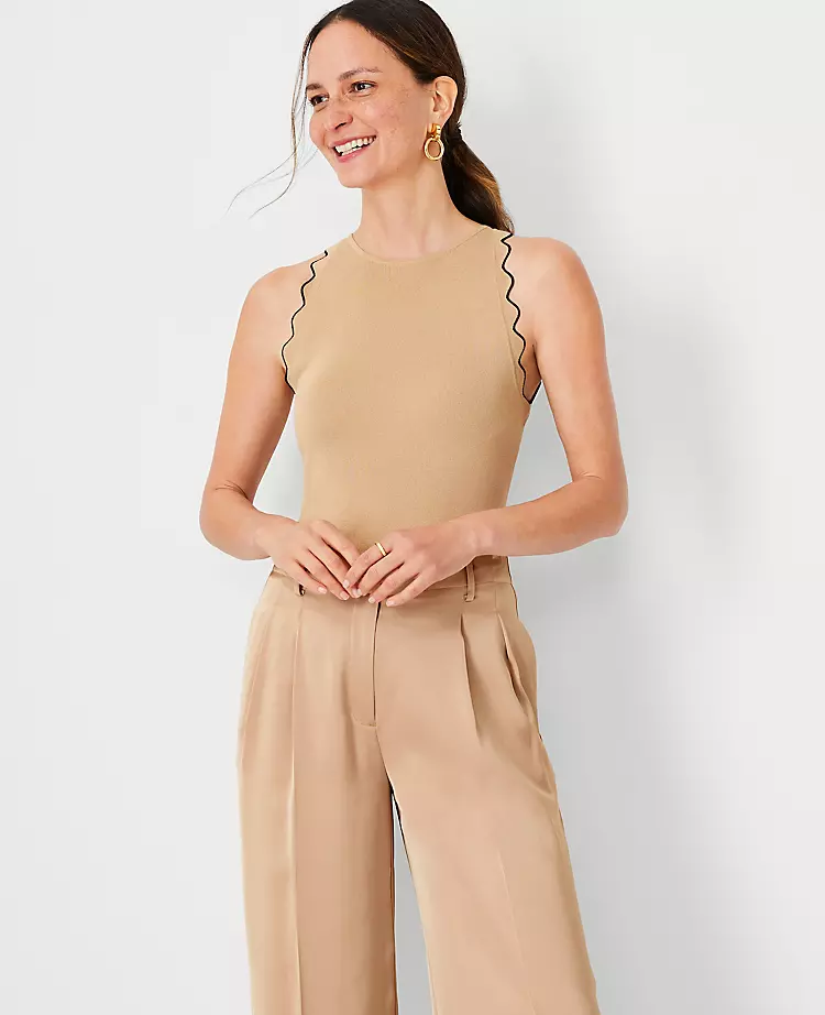 Scalloped trim gives our halter sweater shell an extra pretty edge. Halter neck. Sleeveless.